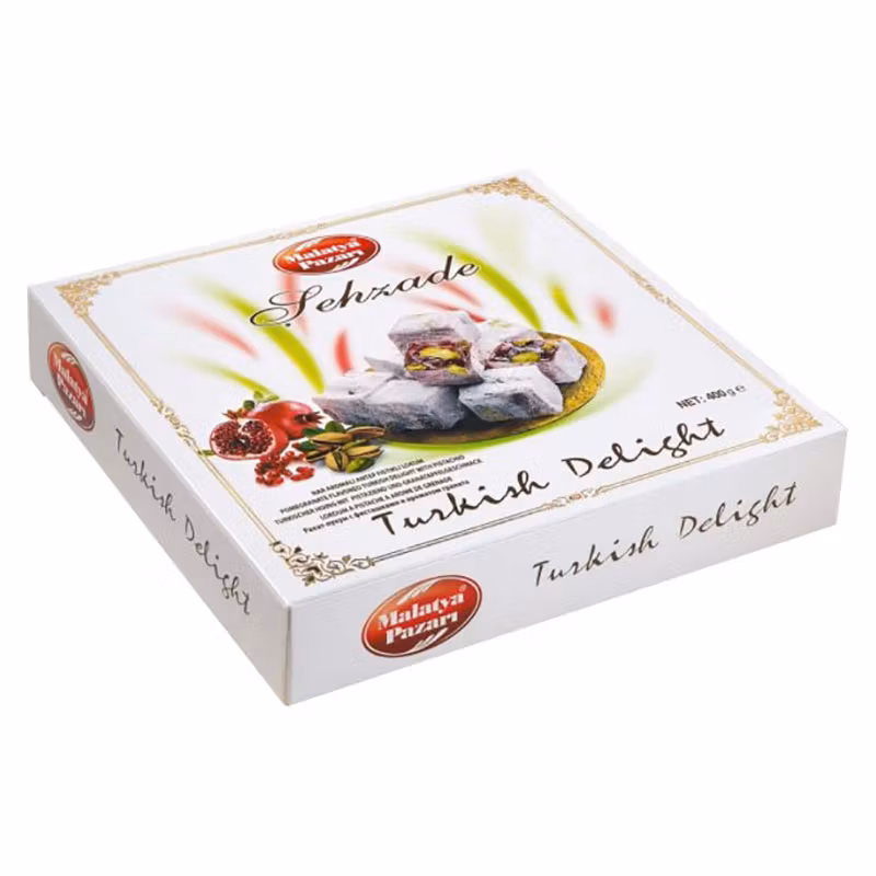 Tyrkisk konfekt med granatæblesmag og pistaciestykker. En sand fornøjelse med en unik smagsoplevelse! Nyd den gode smag af Tyrkiet og Mellemøsten, og invitér til en festlig lejlighed.