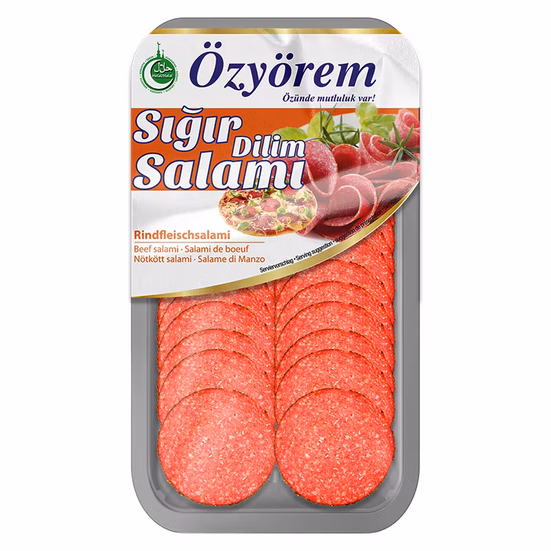 Yörem Beef and Turkey Salami er en smagfuld skiveskåret salami, fremstillet af en delikat blanding af 50 % oksekød, 40 % kalkunkød og 5 % kyllingekød, som giver en rig og afbalanceret smagsprofil. Denne salami er perfekt til at lægge på sandwich, som en del af antipasti eller til at nyde direkte som en velsmagende snack.