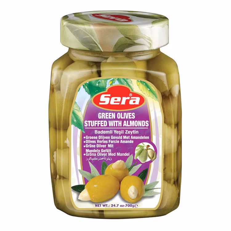 From Sera, a leading brand in Turkish olive products, these green olives with almonds represent a high-quality, authentic product that proudly showcases the richness of Turkish cuisine. Each jar is proof of Sera's commitment to quality and taste.