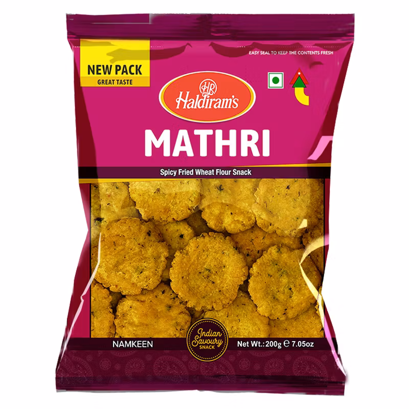 Haldiram's Mathri is a popular snack product consisting of spice fried snacks made from wheat flour. Mathri is a traditional Indian snack known for its crunchy texture and spicy taste.