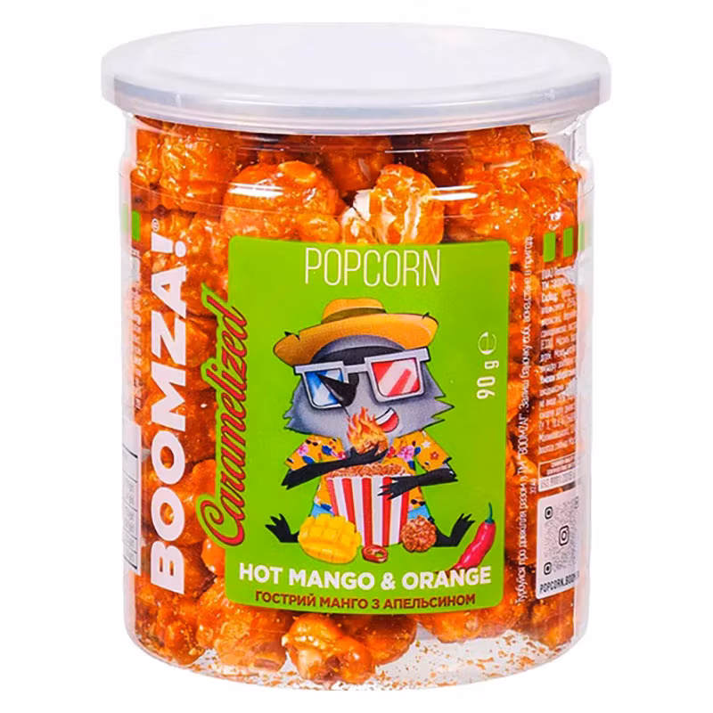 🥭🍊 Boomza Caramelized Popcorn – Mango & Orange delivers an exotic tropical twist. Each kernel is coated in a sweet caramel blend infused with vibrant mango and orange flavors. Crunchy, fruity, and utterly delicious.
