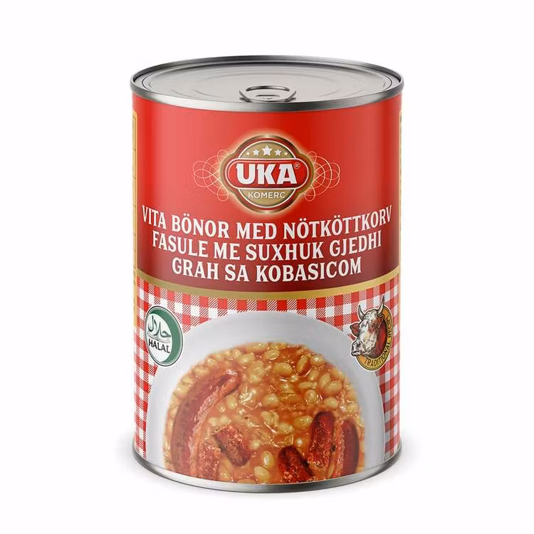 Uka Komerc, ett företag från Makedonien, erbjuder en ätfärdig pastöriserad maträtt med vita bönor och nötköttkorv. Denna maträtt är förpackad och redo att ätas utan behov av ytterligare tillagning.