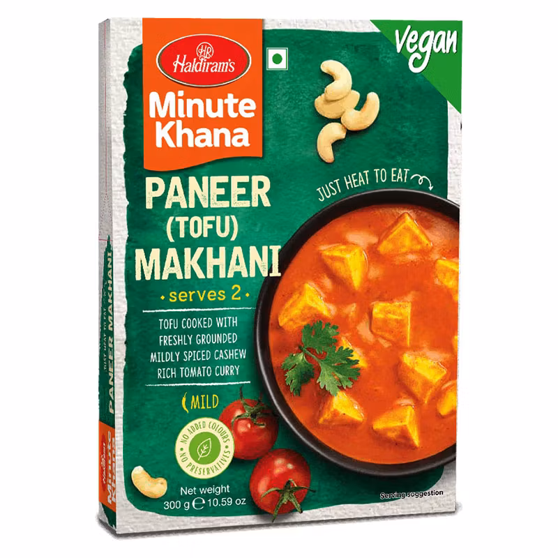 Njut av den rika och krämiga smaken av Haldiram's Paneer Makhani med tofu, en veganvänlig tolkning av den klassiska indiska rätten. Denna delikata rätt innehåller mjuka och saftiga tofubitar som är tillagade i en mild, kryddig smörcurry med nykrossade aromatiska kryddor. Perfekt att servera med ris, roti, naan eller paratha för en autentisk indisk måltid.