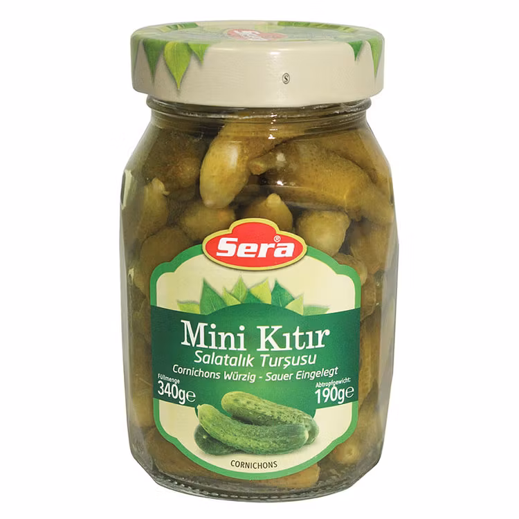 Sera Cornichons är inlagda små, hela minigurkor som erbjuder en krispig konsistens och en syrlig smak. Dessa delikata cornichons är perfekta som tilltugg, i sallader, eller som ett utsökt komplement till en god lantpaté. Tillverkade med omsorg för att bevara sin naturliga krispighet och smak, är Sera Cornichons ett utmärkt val för alla som älskar klassiska pickles.