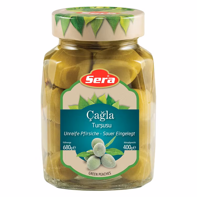 Upptäck en av de mest ovanliga och delikata smakerna från Turkiets rika matkultur – inlagda gröna mandlar från det välrenommerade märket Sera. Dessa mandlar skördas tidigt, innan de hunnit mogna fullt ut, vilket ger dem en krispig konsistens och en syrligt frisk smakprofil som gör dem till ett utpräglat meze-tillbehör eller en aptitretande snacksdelikatess.