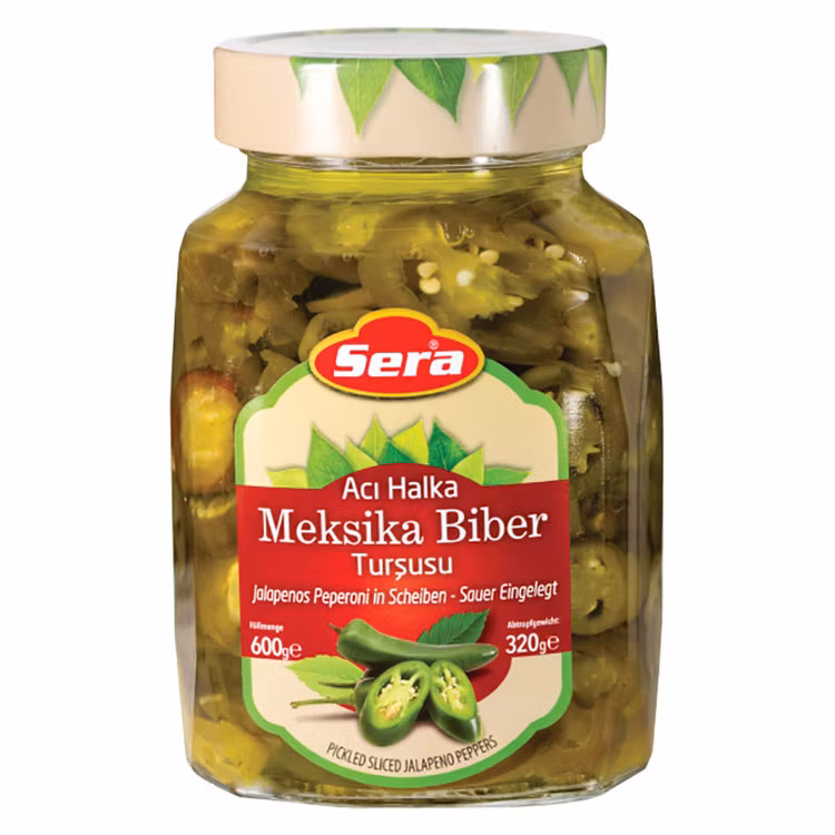 Sera Skivad Jalapeno - Inlagda är en underbar blandning av skivade chilipeppar som är redo att användas direkt ur burken. Dessa jalapenos är något mildare och bredare i smaken än Serrano chili, vilket gör dem till ett utmärkt val för de som föredrar en mer måttlig hetta. De är otroligt mångsidiga och kan användas i en mängd olika rätter, från tacos och pizza till sallader och wraps.