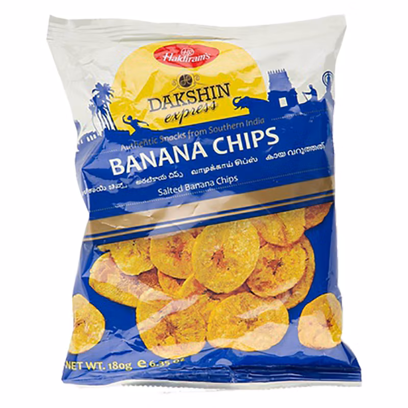 Haldiram's Banana Chips är en snacksprodukt som består av tunna skivor av banan som har blivit torkade eller friterade till en krispig och saltad godbit. Dessa saltade bananchips är ett populärt snacksalternativ som kan ätas ensamma eller som tilltugg till andra rätter.