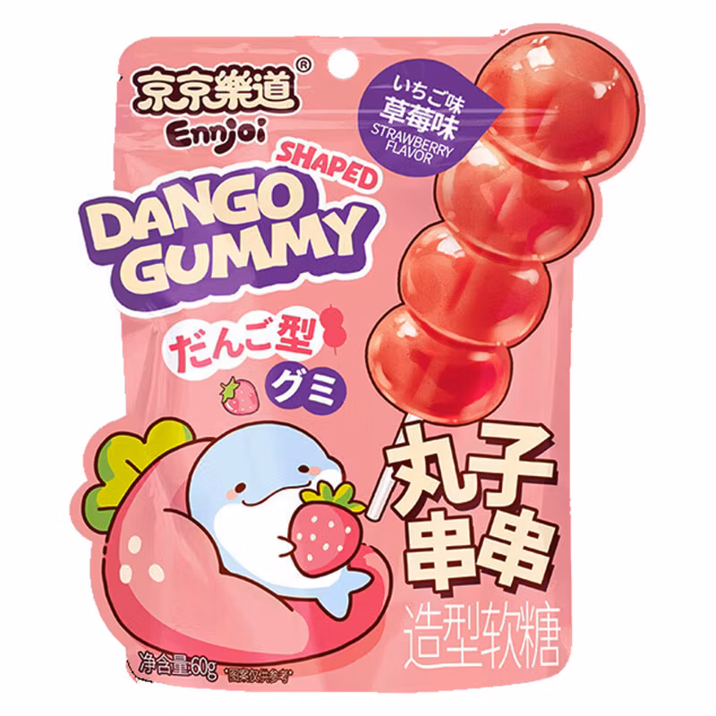 Njut av Dango Shaped Gummy Jordgubbssmak, ett charmigt segt godis inspirerat av den klassiska japanska dangon! Dessa små färgglada godisbitar är formade som traditionella dango-kulor och bjuder på en ljuvlig smak av solmogna jordgubbar. Perfekta att njuta av som ett roligt mellanmål, på kalaset eller som en smakrik gåva. Med sin mjuka och sega konsistens och naturliga jordgubbssmak ger dessa gummies en underbar mix av kultur och söt njutning.