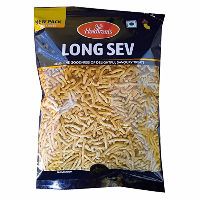 Haldiram's Long Sev snacks är en populär snacksprodukt som består av krispiga kikärtsnudlar i form av långa, tunna strängar. Dessa snacks är kända för sin knapriga textur och distinkta smak.