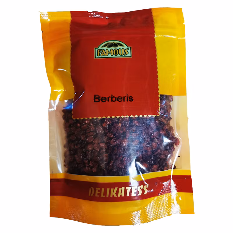 Famous Torkade Berberis är en kraftfull ingrediens med en intensiv syrlig smak, ofta använd i traditionella persiska och mellanöstern rätter. Dessa små, torkade bär ger en unik syra och friskhet som kompletterar både salta och söta rätter.