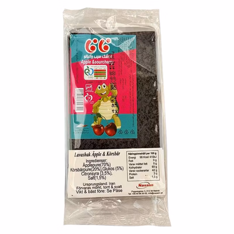 Upptäck smaken av Lavashak Platt – Körsbär & Äpple, även känd som pestil – ett traditionellt fruktläder från Mellanöstern som kombinerar den sötsyrliga smaken av körsbär med det friska från äpple. Tillverkad av naturligt torkad fruktpuré utan tillsatser, är detta en smakrik och näringsrik energikälla för både barn och vuxna.