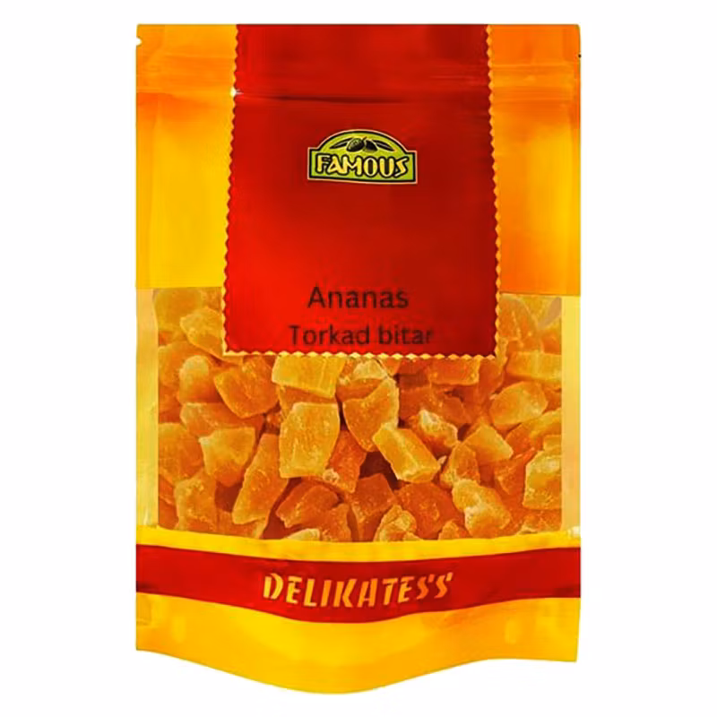 Famous Torkad Ananas är en delikat och hälsosam godbit som är perfekt att njuta av direkt ur påsen eller som ingrediens i olika rätter. Dessa ananas kuber är rika på vitaminer A, C och B, samt viktiga mineraler som magnesium och kalium.