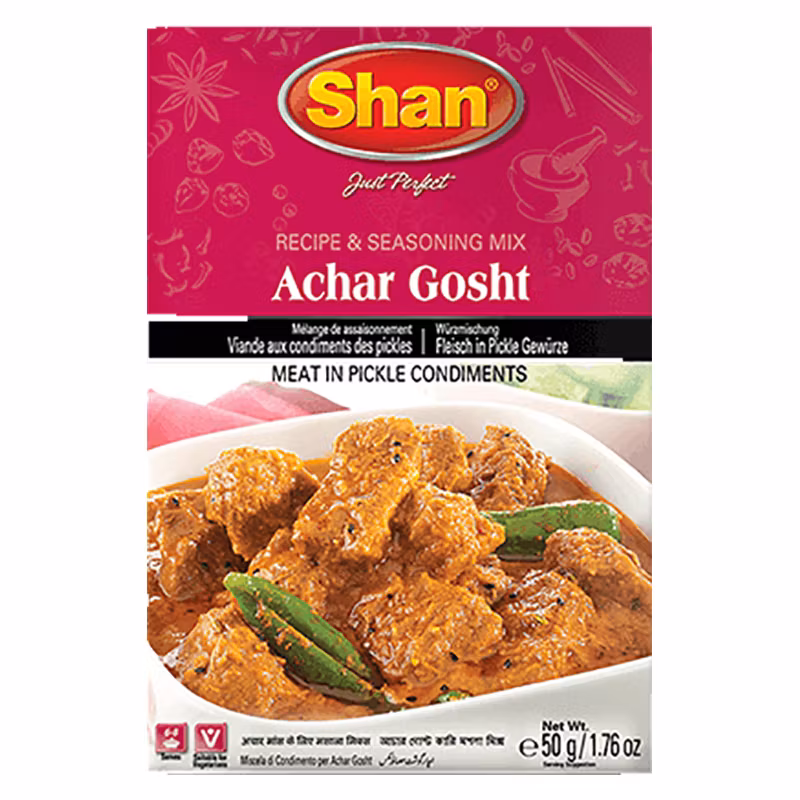 Shan Achar Gosht Mix är en kryddmix som används för att tillaga den populära pakistanska rätten Achar Gosht. Achar Gosht är en kryddig köttgryta som kännetecknas av sin inlagda smak, vilket återspeglas i namnet "Achar" som betyder inläggning på hindi och urdu.