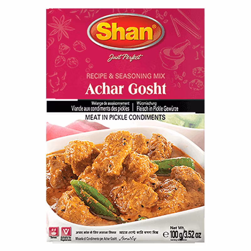 Shan Achar Gosht Mix är en kryddmix som hjälper dig att förbereda den traditionella och smakrika rätten Achar Gosht hemma. Achar Gosht är en populär köttgryta från det indiska subkontinentet som är kryddad med pickle (achar)-liknande smaker.