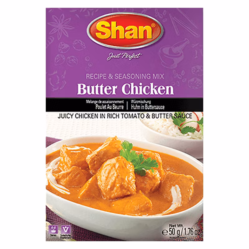 Shan Butter Chicken Mix är en kryddblandning som hjälper dig att förbereda den utsökta indiska rätten "Butter Chicken" hemma. Butter Chicken, även känd som "Murgh Makhani", är en populär indisk kycklingrätt som kännetecknas av sin lena och krämiga sås med en balanserad smak av kryddor och smör.