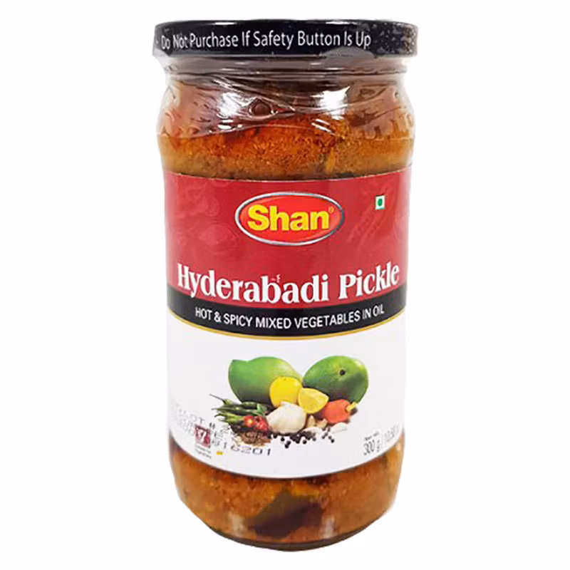 Shan Hyderabadi Pickle är en het och kryddig blandning av olika grönsaker i olja. Här är några egenskaper och användningsområden för denna pickle: