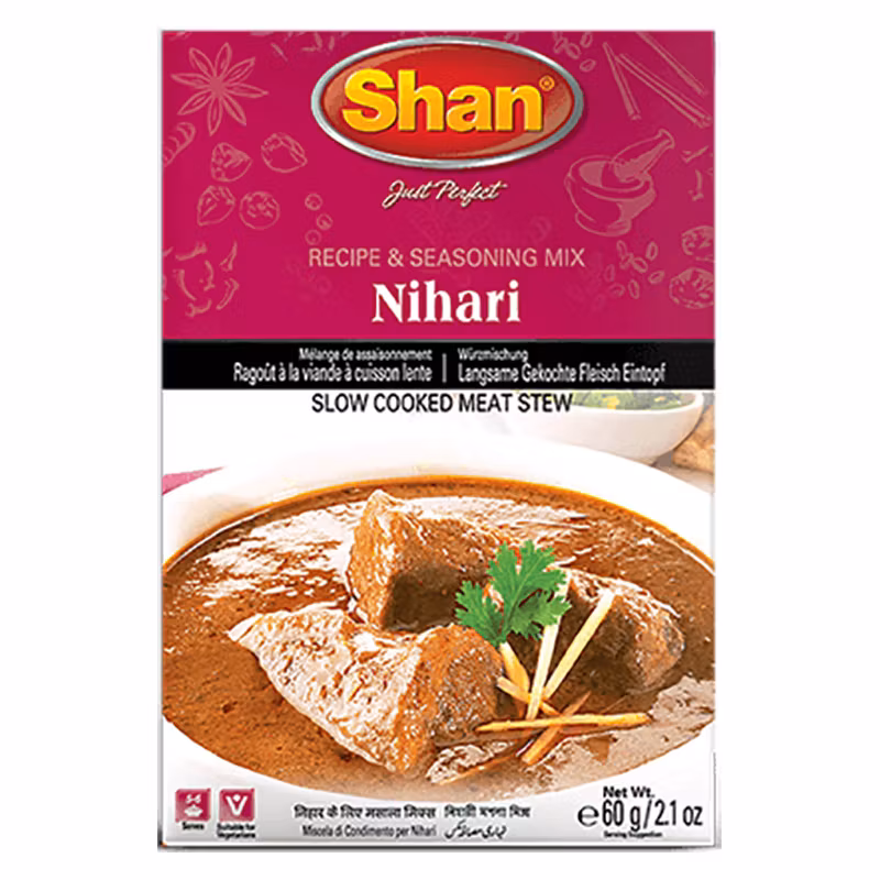 Shan Nihari kryddmix är en kryddmix som hjälper dig att återskapa den autentiska och traditionella smaken av Nihari, en populär köttgryta från den norra delen av den indiska subkontinenten. Nihari är en rätt som vanligtvis tillagas genom långkok av kött, vilket ger en rik och fyllig smak.