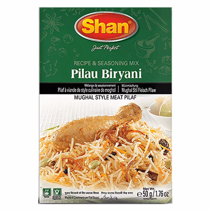 Shan Pilau Biryani kryddmix innehåller en balanserad kombination av kryddor och smaker som är karakteristiska för biryani och pilaff. Kryddmixen kan innehålla ingredienser som koriander, kummin, kardemumma, kanel, lök, vitlök och andra smaksättare.