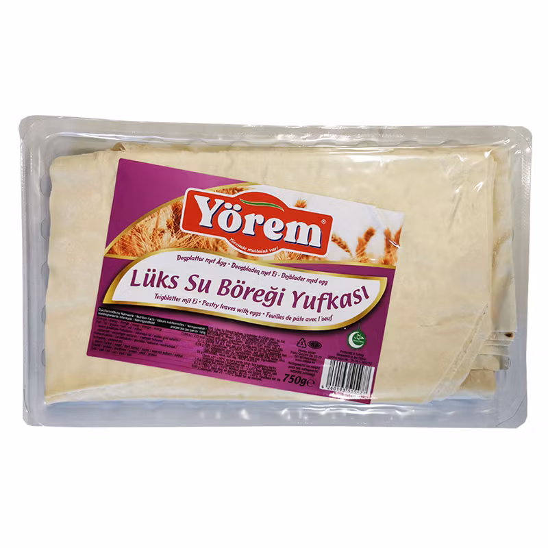 Filodeg till Su Böreği är den avgörande ingrediensen för att lyckas med den klassiska turkiska rätten Su Böreği, även känd som "vattenbörek". Denna filodeg är speciellt framtagen med tillsatt ägg, vilket ger de tunna arken en exceptionell styrka och elasticitet. När de bakas uppnår de en oslagbar frasighet och gyllene färg som skiljer sig från traditionell filodeg. De tunna lagren absorberar vätskan bättre, vilket resulterar i en saftig fyllning och ett frasigt yttre. Använd denna filodeg för att skapa en äkta Su Böreği, men den passar också utmärkt för andra frasiga pajer och bakverk.