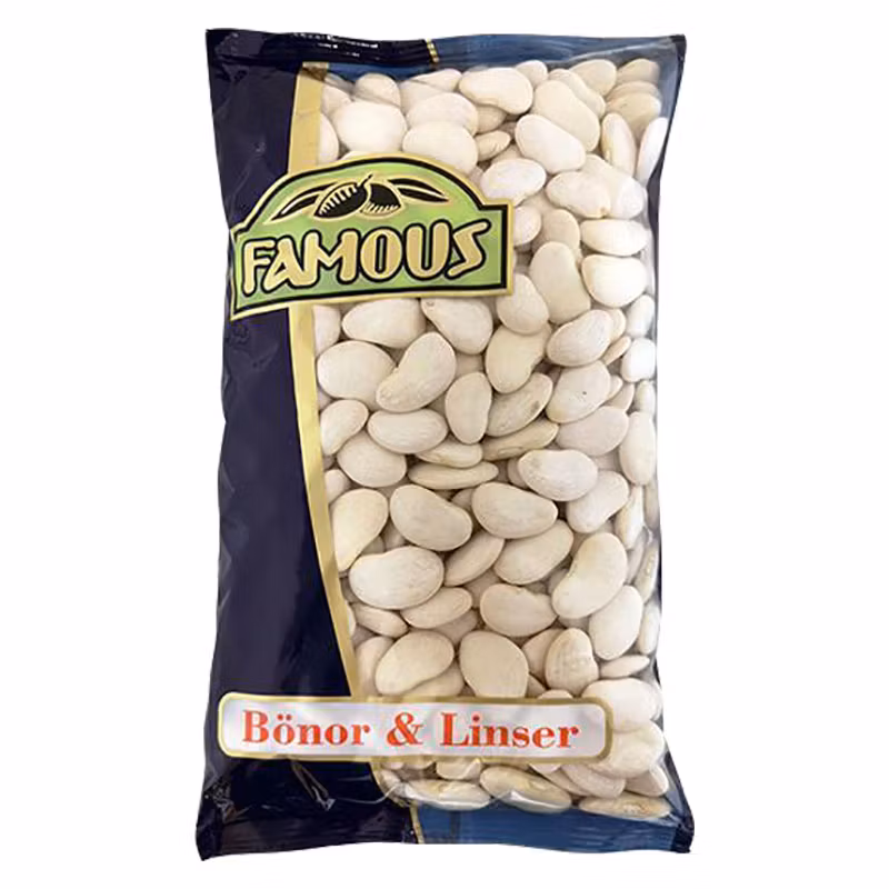 Limabönor - Elefantbönor från Famous. Elefantbönor är kända under flera olika namn, bland annat limabönor och smörbönor (butter beans). De påminner mycket om bondbönor i både färg och form. Kokta elefantbönor har en mild smörsmak som gärna anpassar sig efter andra ingredienser.