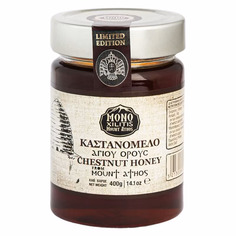 Upptäck den exklusiva Mono Xilitis Kastanjehonungen, även känd som "munkarnas honung", skördad på den heliga halvön Mount Athos i Grekland. Denna unika honung kännetecknas av sin mörka färg, rika konsistens och distinkta, lätt bittra smak – en smakprofil som särskiljer den från andra typer av honung.