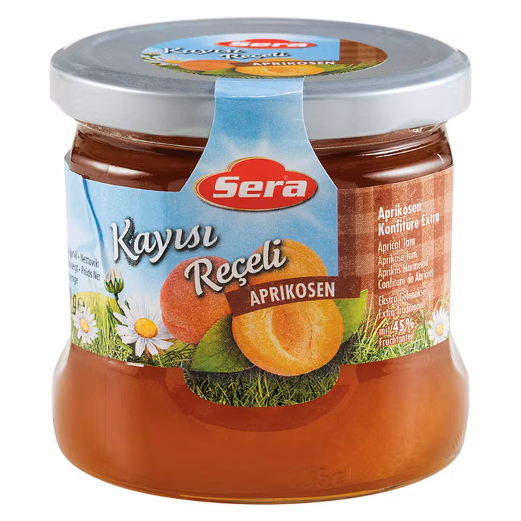 Med sitt ursprung i Turkiet bär Sera Aprikosmarmelad med sig den genuina smaken och traditionerna från landet. Du kan känna dig trygg med att du får en produkt av högsta kvalitet som har vunnit Turkiets förtroende och popularitet.