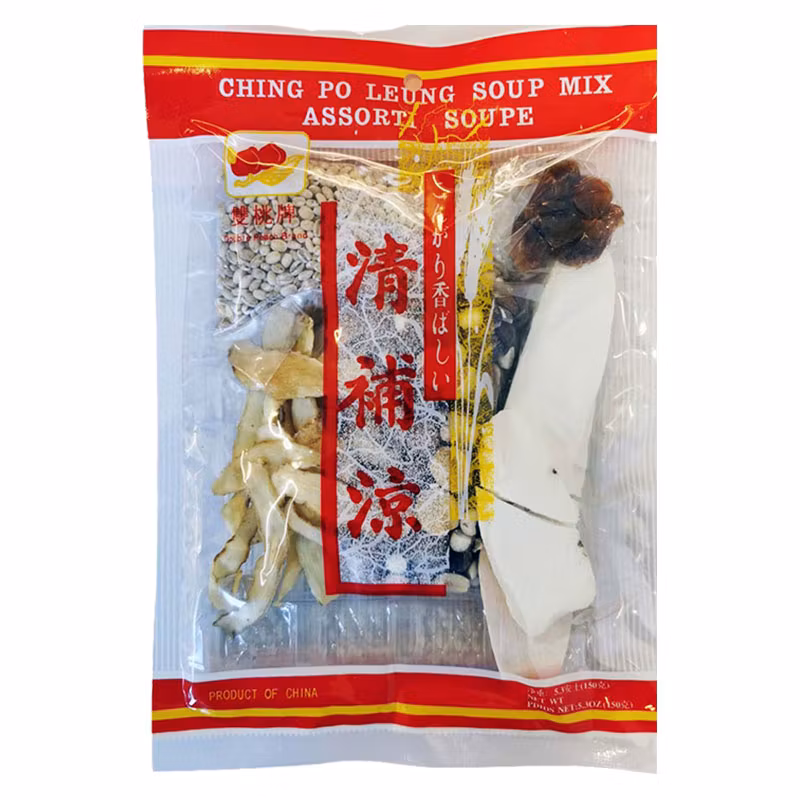 Ching Po Leung Soppmix är en traditionell kinesisk örtblandning som används för att skapa en närande och balanserad soppa, älskad i det kantonesiska köket. Denna mix består av noga utvalda ingredienser som torkad lotusfrö, coix-frö, yams och kanderade dadlar, vilka tillsammans ger en mild, lätt sötaktig smak. Soppan, som ofta serveras som en del av en hälsosam måltid, är känd för sina stärkande egenskaper och anses vara idealisk för att "kyla ner" kroppen och bibehålla en inre balans. Det är ett perfekt sätt att uppleva den traditionella kinesiska medicinens filosofi genom matlagning.